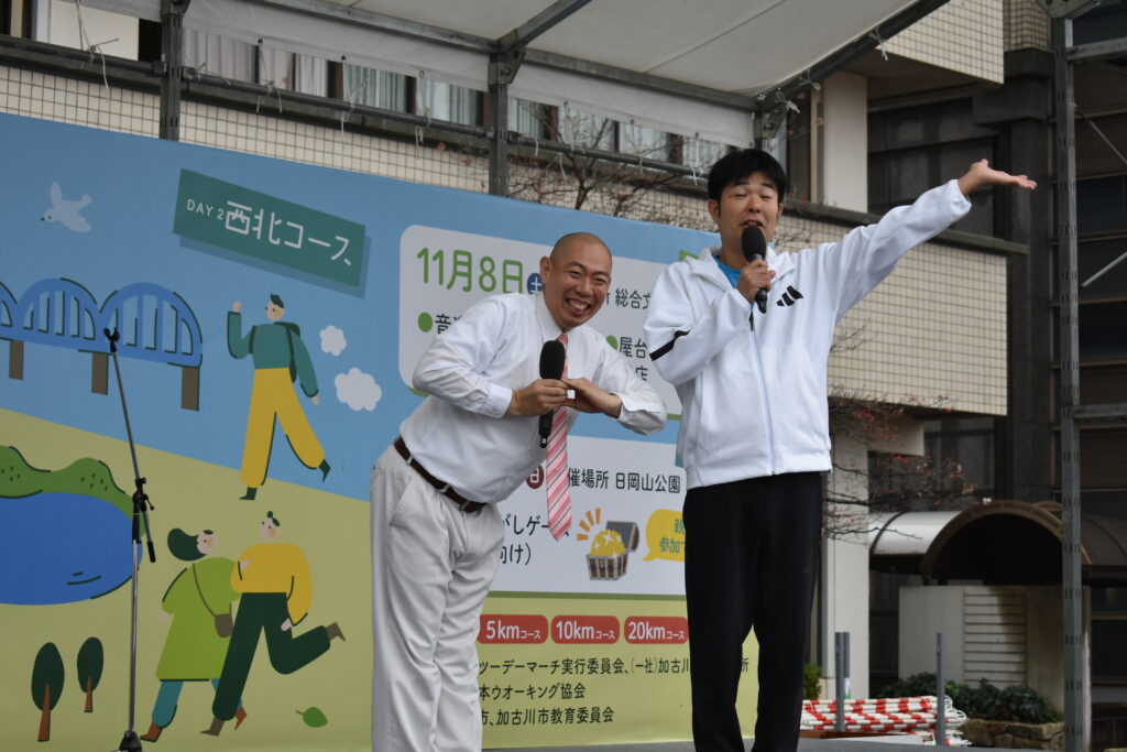 市制75周年記念事業として開催された本大会は、2日目に特別ゲストとして、日本ウオーキング協会の健康ウオーキング指導士でもあるお笑い芸人「レギュラー」にご来場いただき、参加者と一緒に5㎞コースのウォーキングや、中央会場でお笑いライブなど、大会を大いに盛り上げていただきました。また中央会場やコース上では、飲食ブースや健康関連ブース等の出店があり、ゴール後には和太鼓の演奏、チアリーディングやパントマイムのパフォーマンスでウォーカーの皆様に楽しんでいただきました。