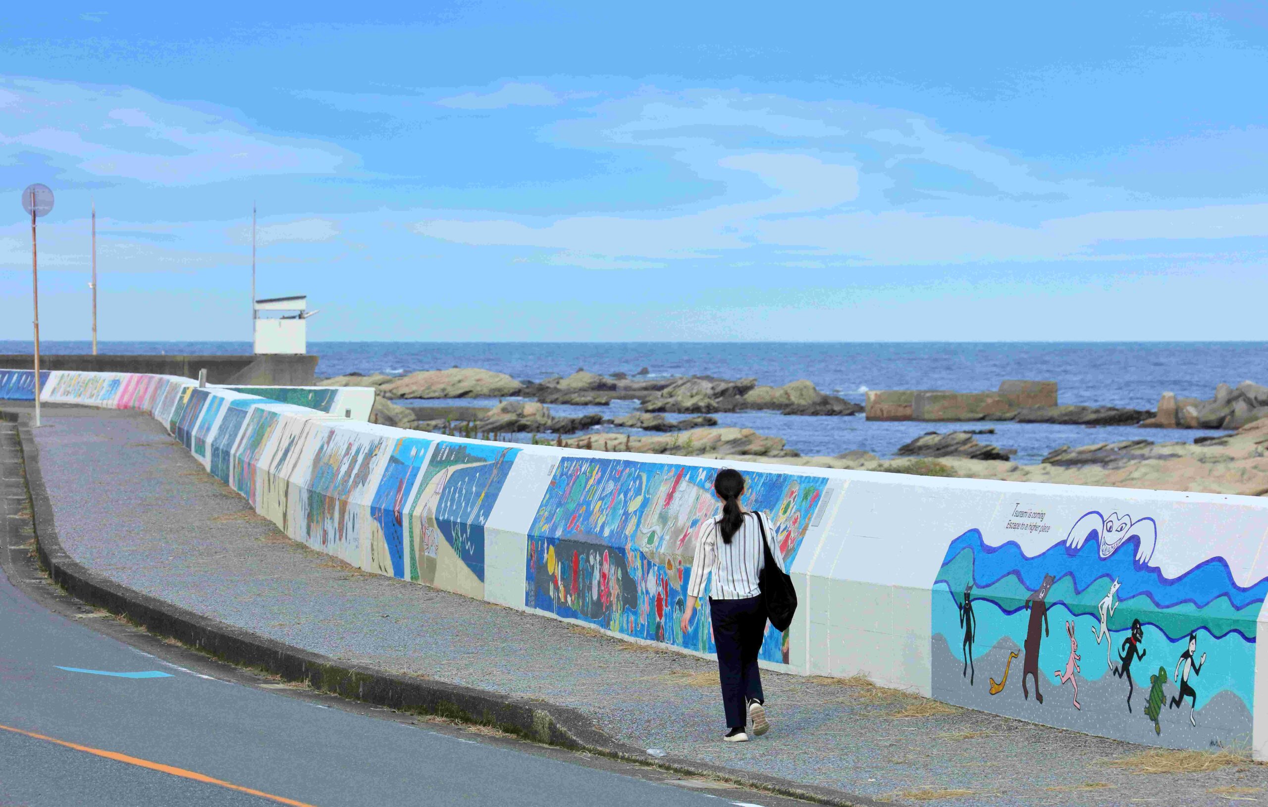 南房総にゆかりがあるアーティストが中心となり、地元の小中学生とともに制作に参加した、全長1.5km以上に渡り展開する防波堤アートです。潮風を感じながらアートに触れることができます。