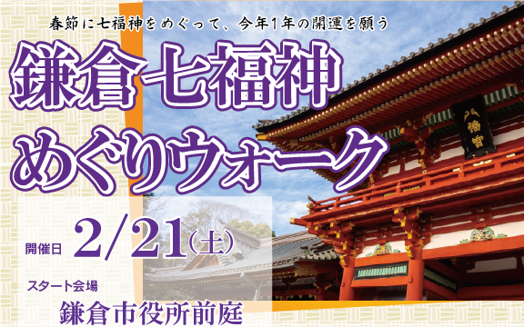 | コース | 受付&スタート時間 9:30~10:30 ゴール受付時間 11:30~14:30 【ハーフコース】 七福神のうち、五福神をめぐるコースです。 各スポットでフォトロゲイニング(指定された写真のスポットを探す)やビンゴゲームをしながら楽しく今年の運試しに挑戦しよう! ◆スタート(鎌倉市役所前庭)→浄智寺(布袋様)→鶴岡八幡宮(弁財天様)→宝戒寺(毘沙門天)→妙隆寺(寿老人)→本覚寺(恵比寿様)→ゴール(鎌倉市役所前庭) 【フルコース】 前半はハーフコースを楽しみながら、中間地点(ハーフコースゴール)に戻り、後半は江ノ電に乗って(もちろん歩いてもOK)ゴールの江島神社を目指す七福神(全8ヵ所)をめぐるコースです。途中、観光名所やフォトスポットに立ち寄ったり、湘南グルメを楽しみながら、早春の湘南を満喫しましょう! ◆スタート(鎌倉市役所前庭)→浄智寺(布袋様)→鶴岡八幡宮(弁財天様)→宝戒寺(毘沙門天)→妙隆寺(寿老人)→本覚寺(恵比寿様)→中間地点(鎌倉市役所前庭)→長谷寺(大黒様)→御霊神社(福禄寿様)→江島神社(弁財天様:ゴール自由解散) |